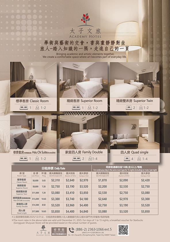 修齊館房價資訊已同步整合於太子文旅成大館官網,歡迎點選下方連結查詢最新方案與價格資訊。